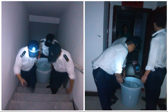由于停电,电梯也不能用。业主家的装修材料到了小区,无法用电梯送到业主家。为了不让业主着急,我们的安防人员不畏酷暑,帮业主把装修材料从一楼开始爬楼梯一步一步地抬到业主家。同时,为了解决已入住业主的日常用水困难,连续几天我们的安防员主动的把生活用水从一楼抬到12楼和5楼的业主家里。