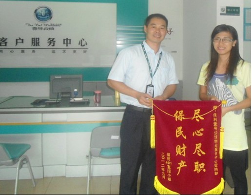 罗伟定 9月6日下午15:16分,壹号公馆安防班长梁仕杰和信苑的客户主任杜涛在车库例行巡检时,发现一辆车牌号为E.524C9的全新的摩托车未拔钥匙,立即留守现场,并电话通知服务中心前台协助盘查车主,经过近1多小时查看监控录像和出入人员的询问,终于寻找到车主为信苑401明杰公司的招小姐,当安防部工作人员告知该情况时,招小姐才晃然大悟,随即服务中心工作人员告诉她,车在安防部,没丢!但需招小姐提供一下相关证件进行确认。 当招小姐领回自已的爱车时,两眼湿润,连声感谢,并当场掏出数百元要感谢值班安防兄弟时,被安防部领导婉拒,并告诉招小姐,这是我们应该做的,是我们的职责。 在9月8日下午,招小姐为了表达对壹号公馆安防部工作认真负责,特送上一面锦旗,以表谢意!