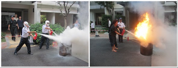 警戒组负责各个出入口、外围的警戒及接引消防车;疏散组人员组织人员弯着腰,捂住口鼻,沿着楼梯通道快速撤离到安全区;工程组负责消防设施的运行,确保火灾救援工作正常进行;灭火组人员负责扑救火灾,利用灭火器械,控制火势,等待消防中队的到来;后勤保障组负责物资供应,保障消防物资充足。灭火演练结束后,安防部组织扑灭油桶表演、现场演示了灭火器如何使用的操作程序,并让部分业主亲自体会一下使用灭火器灭火的过程,使业主掌握了正确使用灭火器的操作方法。